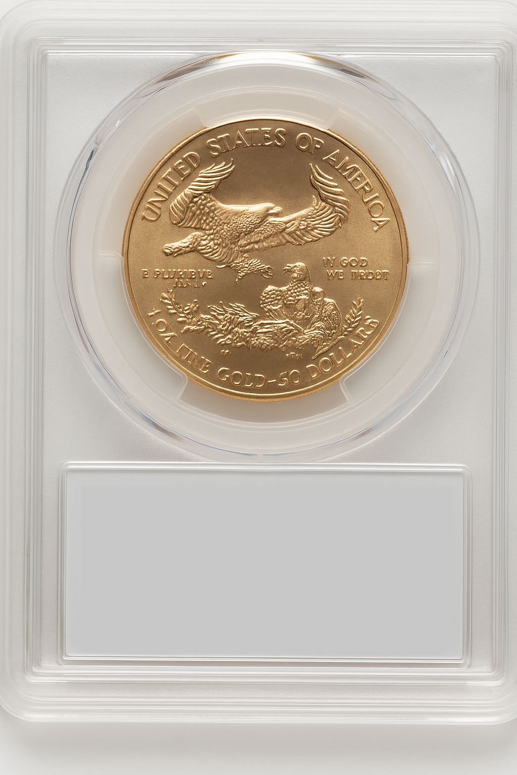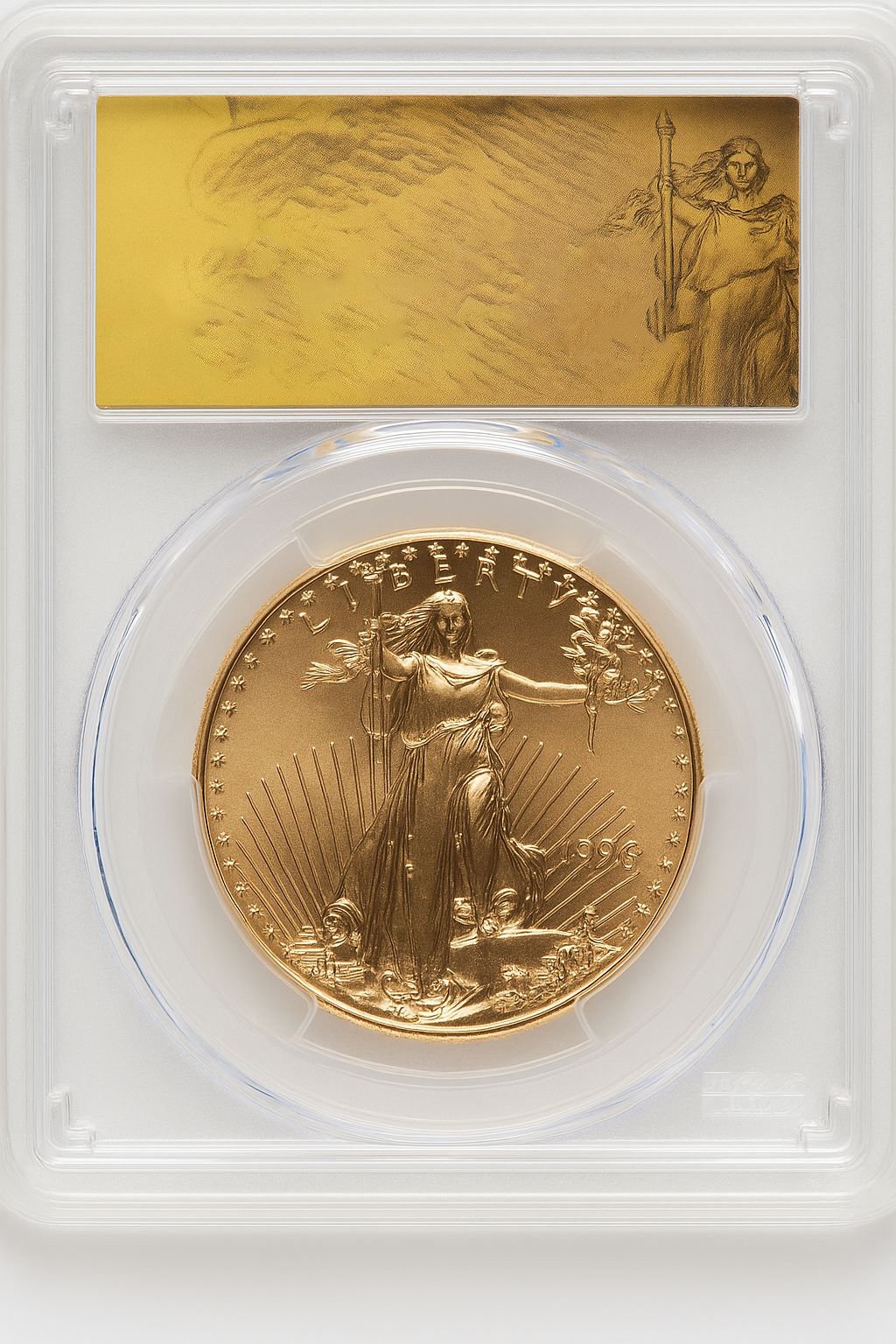 This 1996 $50 One-Ounce Gold Eagle with the Saint Gaudens label has been certified and graded by PCGS as MS70. PCGS’s encapsulation guarantees the coin’s pristine MS70 condition.