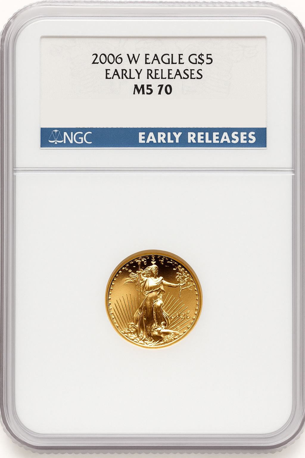 This 2006-W $5 Tenth-Ounce Gold Eagle ER Blue has been certified and graded by NGC as MS70. NGC’s encapsulation guarantees the coin’s flawless MS70 condition.